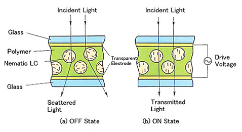 在沒有通電的情況下呈現霧狀,通過交流電作⽤用會使內部液晶分⼦子呈現有序排列,這時智能膜便從透光不透明狀態變為透明狀態,透過電流開與關,就能簡單實現透明與不透明之間的快速轉換。